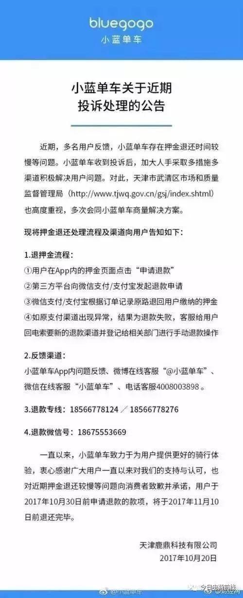 10月20日,小蓝单车曾发布公告称,用户于2017年10月30日之前申请的退款,将于2017年11月10日前退还完毕。